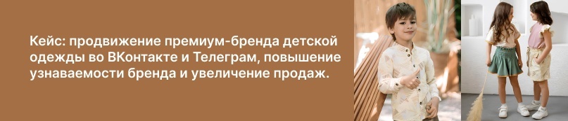 Хочу поделиться с вами кейсом команды моего агентства по продвижению премиум-бренда детской одежды. В работе было 2 соцсети: Вконтакте и Telegram. Наша задача заключалась в комплексном ведении и продвижении аккаунтов бренда на этих двух площадках для увеличения продаж.