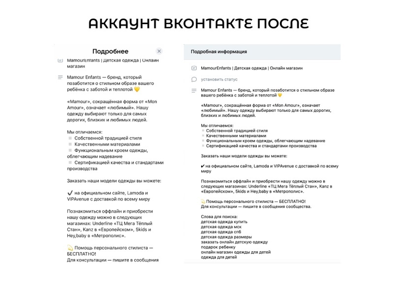 Во Вконтакте мы делали акцент на информационные посты с подробной информацией о моделях, используемых тканях, размерной сетке и в целом – о производстве одежды.